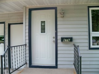 We have yet to landscape (that is a project for next year) but we did spend a little time updating the outside. The house seemed to be too light – there were white doors, white windows, and white gutters, and light gray siding. We thought it needed something to pop a bit. We had thought about shutters, but the windows are not a standard size and there isn’t much space between them for shutters. There were metal flashing on the windows that were paintable, so we decided we would try to paint the trim and see if that helped. We replaced the front door, painted the garage and service doors, and painted the trim.