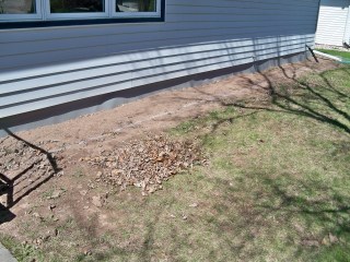 We have been doing some work outside and wanted to post a few pictures to update you all on the progress. Over spring break I back-filled the front with a few yards of dirt, as it was sinking towards the house. Last weekend I put pavers for the border while J worked on the garden in the back. This weekend we planted a large periannual and 4 shrubs – Left to right: red husker penstemon, tauton’s yew (slow spreading), ruby hagg burning bush, varigated red twig dogwood, and serviceberry. They look small now but all of them but the penstemon will be over 4′ wide. We may plant a few annuals or other small plants to fill in for the time being, but this is what we have for now.