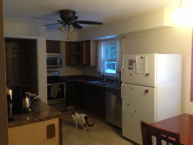 Yes, that is right – the highlight of our project is that we now have a dishwasher AND a vent over the stove. The previous set-up had a hole in the ceiling that made it look like there used to be a vent over the stove, but the microwave they left us didn’t vent; I am guessing that the vent had been gone for years and they just used a ceiling fan to vent the fumes when something was burning (or she was just that good that she never burned anything). As for the dishwasher, J is the most excited because he has to do the dishes he makes all week while I am down at school. Our sink is going to be much more sanitary now that there won’t be day old dishes hanging out in it all of the time.