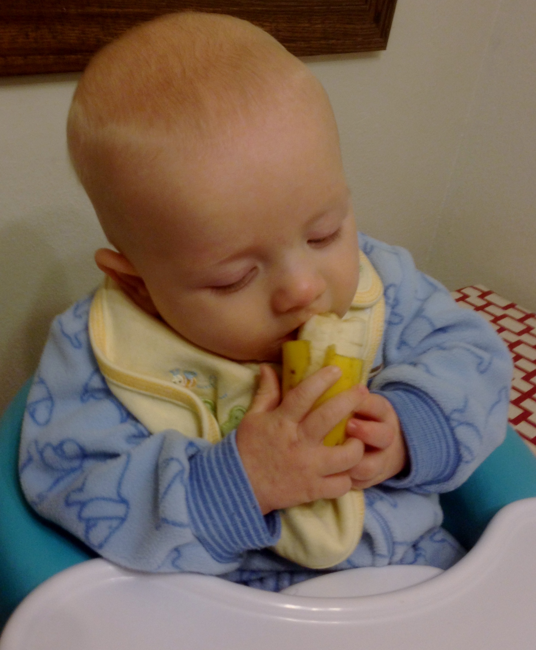 Around 4 months, Eli was sitting up unassisted in his bumbo and started to take a lot of interest in what we were eating. He would grab at everything and bring it to his mouth. It was obvious that he wanted to join in. So I realized that waiting to 6 months wasn’t appropriate – he was ready for solids at 4 months, regardless of what some book says. All kids are different and the key is to use the guidelines as guidelines and modify them as needed for the individual child. So Eli’s first food – a banana! He handled it so well. Take a look here. We offered him foods here and there, but nothing rigid. We decided it was more about him learning about new foods than getting his nutrition from them (he was still eating breast milk the rest of the time and growing well). There were some foods that scared me a bit and I decided it was best to do a modified version of BLW. He got some textured purees, like applesauce, and some solids. Sometimes we fed him, sometimes he used his food feeder, and other times he just used his 2 hands.