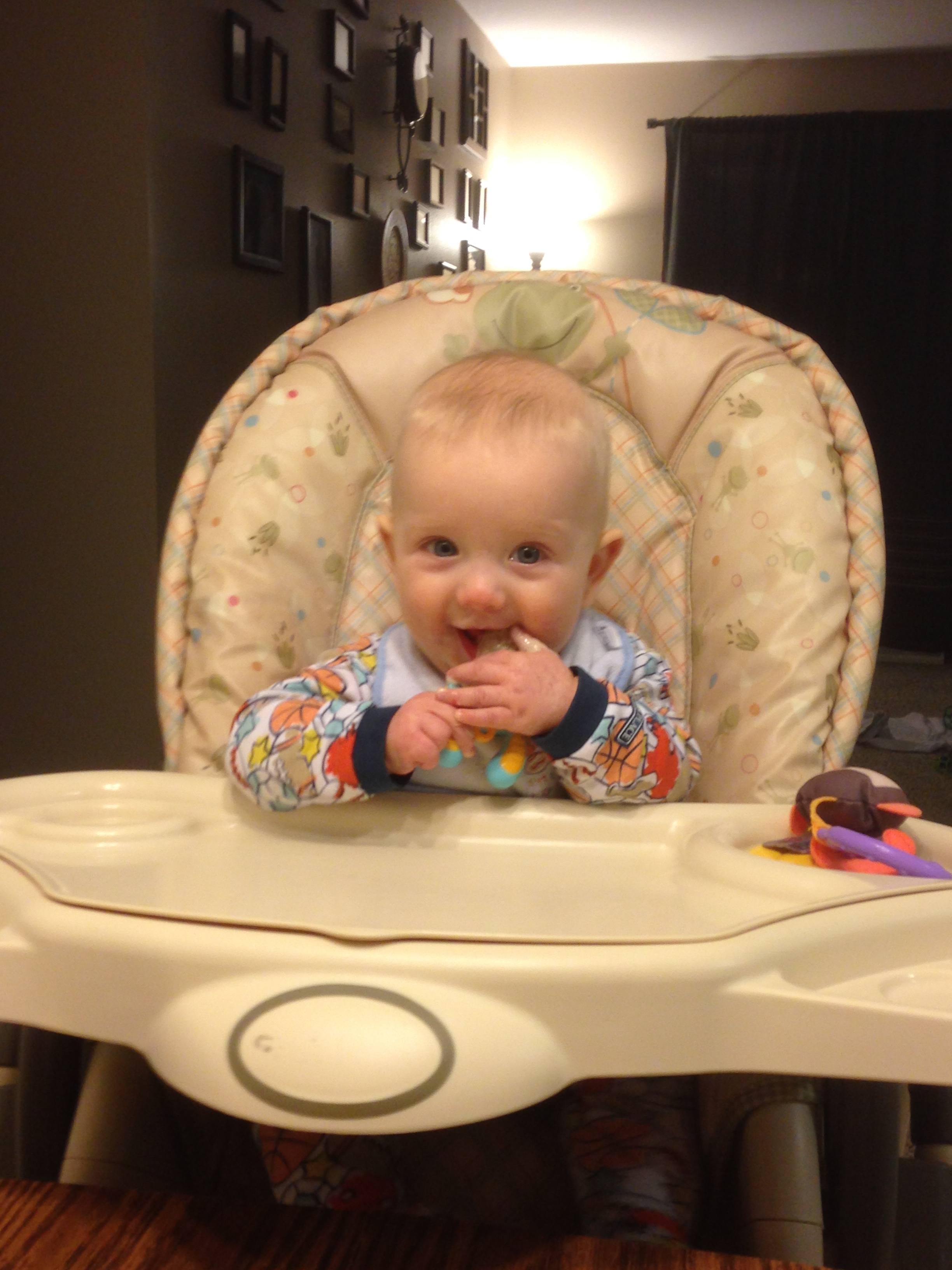 Around 6 months we decided to be more regular with his solids. We began offering him 3 meals a day and were trying a variety of foods. We offered mixed foods and didn’t follow the traditional “1 food for 3- 5 days” method. Yes, there was a chance he wouldn’t tolerate a food and we wouldn’t know what the cause was, but I was willing to take the risk. He was developing a very broad palate and absolutely loved food. Around 7 months he had the chewing (or gumming since he doesn’t have teeth) motion down. I was amazed watching him – how did he figure that out?!? I could give him a strip of toast or chicken and he could gum the whole thing down without gagging once. Amazing. I’ve taken pictures of Eli trying new foods over the past few months and plan to put page together with all of these. In the meantime, here are a few to enjoy!